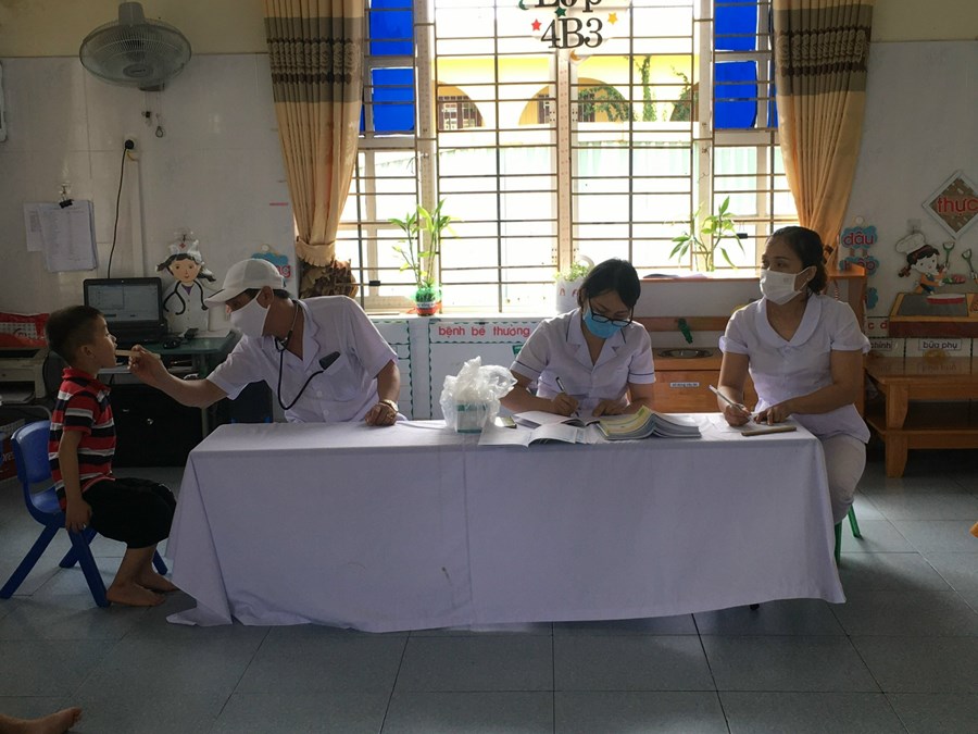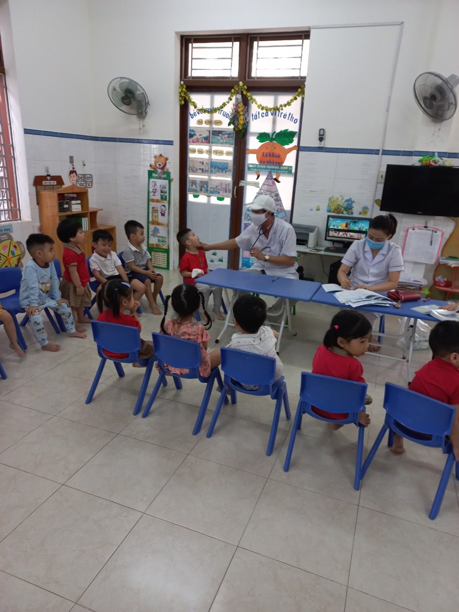 gày 29/9/2022 Trường Mầm non Hải Thành phối hợp với Trạm y tế phường tổ chức khám sức khỏe định kỳ cho 100% các cháu trong nhà trường với các nội dung: Cân, đo chiều cao, khám tai, mắt, mũi, họng, kiểm tra tim phổi và một số bệnh liên quan đến đường hô hấp, da liễu ...